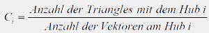 Der Clustering Coefficient [CC] C ist dabei definiert als die Wahrscheinlichkeit, mit der ein Hub (a), der schon mit einem anderen Hub (b) verbunden ist, mit einem weiteren, dritten Hub (c) verbunden ist, welcher wiederum schon mit dem zweiten (b) einen gemeinsamen Vektor hat. Das ist im Beispiel zwischen b, e und f der Fall. Solche Triangles können als Wert für die Dichte von Netzwerken betrachtet werden. Für einen Hub wird C wie folgt berechnet: