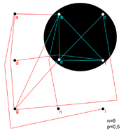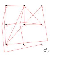 Komplexe Netzwerke entstehen durch die Modellierung von Eigenschaften der Vectors und der Hubs. Erdös-Rényi [5] Zufallsgraphen sind der erste Schritt in diese Richtung. Hier werden den Hubs die Vektoren mit der Wahrscheinlichkeit p zugeteilt. p=0,5, wie in Abbildung 3 verwendet, bedeutet, dass jede mögliche Verbindung zwischen den vorhandenen Hubs mit dem Wahrscheinlichkeitswert von 0,5 gesetzt wurde. Dies bedeutet unter anderem, dass die Hubs unterschiedlich viele Vectors haben können. In diesem Beispiel sind das bei e=4, c=2 und i=1.